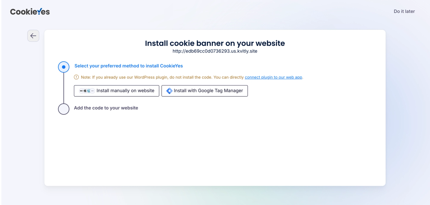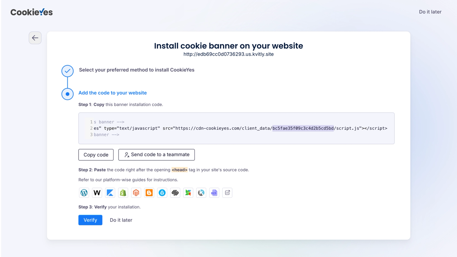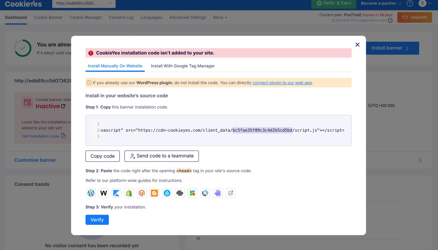 После входа в систему выполните следующие шаги, чтобы установить баннер CookieYes на вашем сайте 🌱kvitly:
