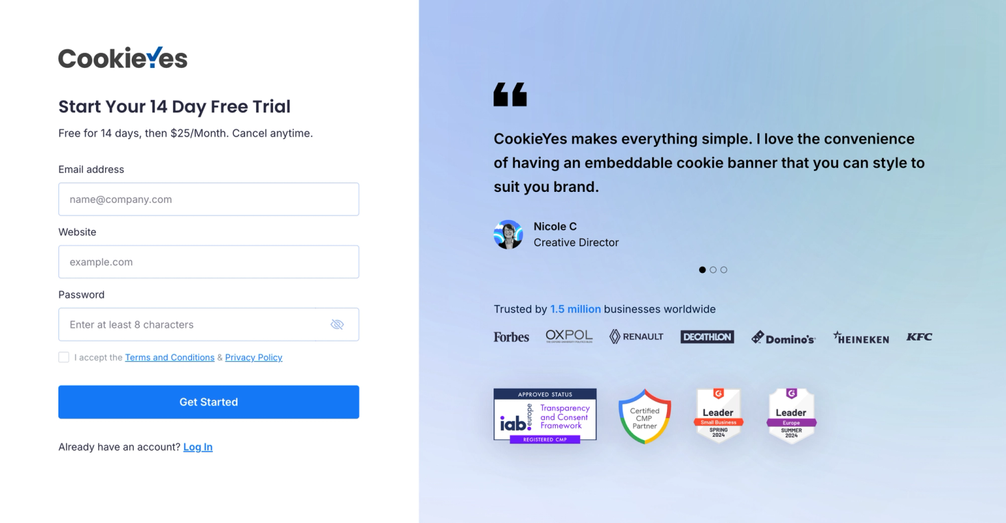 Чтобы начать работу с платформой, перейдите на сайт CookieYes и зарегистрируйтесь, чтобы создать аккаунт, нужно ввести свой email, адрес сайта и придумать пароль. CookieYes запросит у вас платежные данные, и этот шаг нельзя пропустить, однако вы сможете перейти на бесплатный тарифный план.