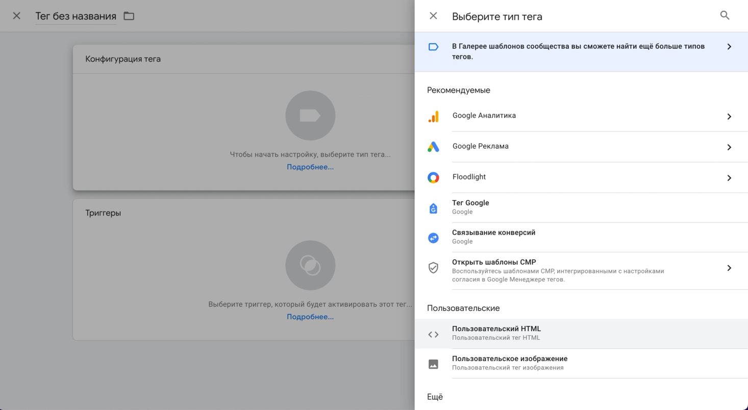 К примеру, создадим новый тег «Пользовательский HTML». Его можно скопировать или написать вручную.
