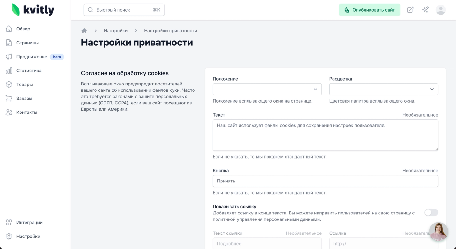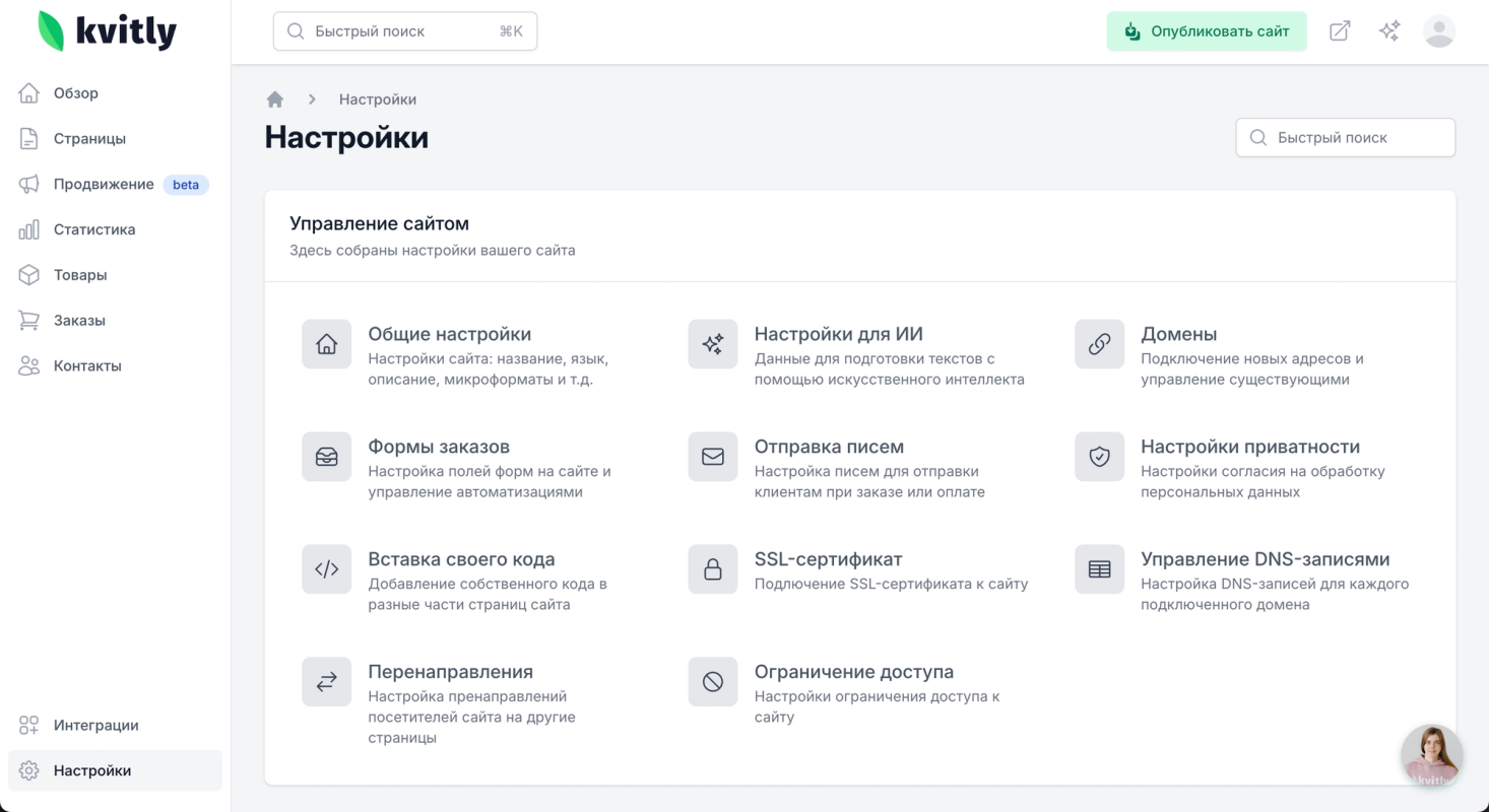 Мы всегда готовы помочь вам с запуском сайта или ответить на любые вопросы по работе с 🌱kvitly.