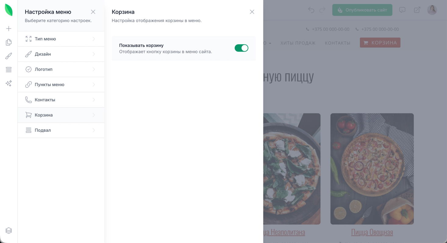 Перейдите в редакторе в раздел «Меню и подвал», выберите раздел «Корзина» и переведите переключатель в активное состояние.
