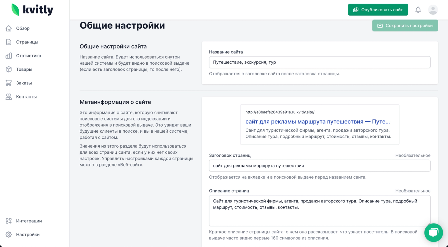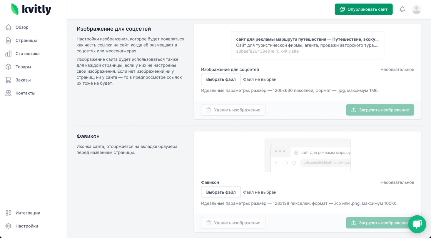 В настройках сайта, в разделе Информация перенесите метаданные со старого сайта: его название и заголовок, который виден в поисковой выдаче, описание сайта и ключевые слова, по которым его будут находить, прикрепите изображение для социальных сетей и фавиконку для вкладки.
