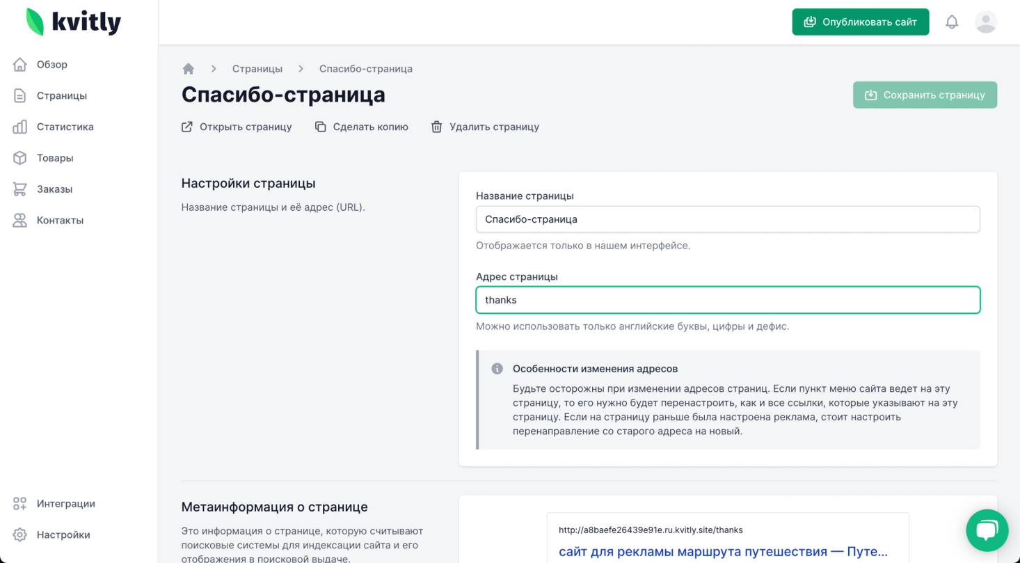 Чтобы изменить URL-адрес, надо перейти в редактор сайта, в раздел «Страницы», выберите страницу, название которой необходимо изменить. На странице настроек напишите название страницы и адрес, по которому она будет открываться, сохраните изменения.