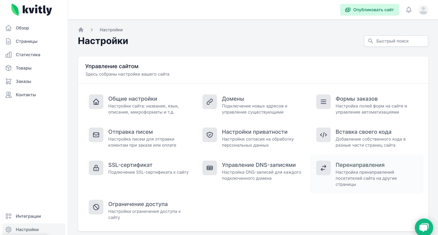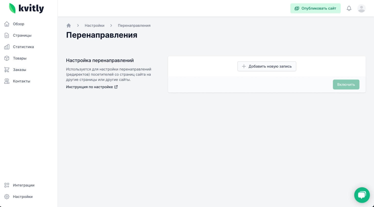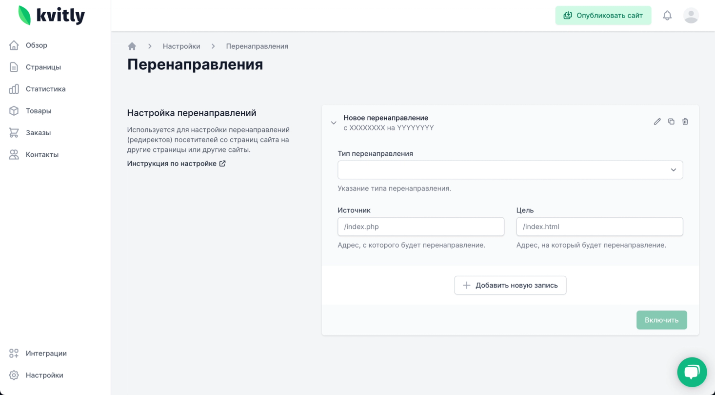 Настроить редирект 301 в 🌱kvitly можно самостоятельно. Для этого достаточно перейти в настройки сайта, в раздел «Настройки» и выбрать раздел «Перенаправления». Затем нажать на кнопку «Добавить новую запись» и произвести настройки. В поле «Источник» ввести старый адрес, а в поле «Цель» новый, выбрать тип перенаправления и нажать на кнопку «Включить».