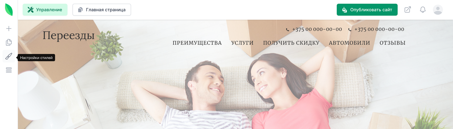 Чтобы выбрать шрифт для сайта, нажмите в меню редактора на кнопку «Настройки стилей»