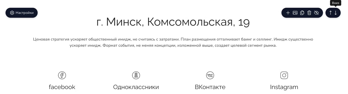 Чтобы переместить раздел вниз или вверх по на странице, наведите на раздел и нажмите на стрелку вниз или вверх в правом верхнем углу раздела.