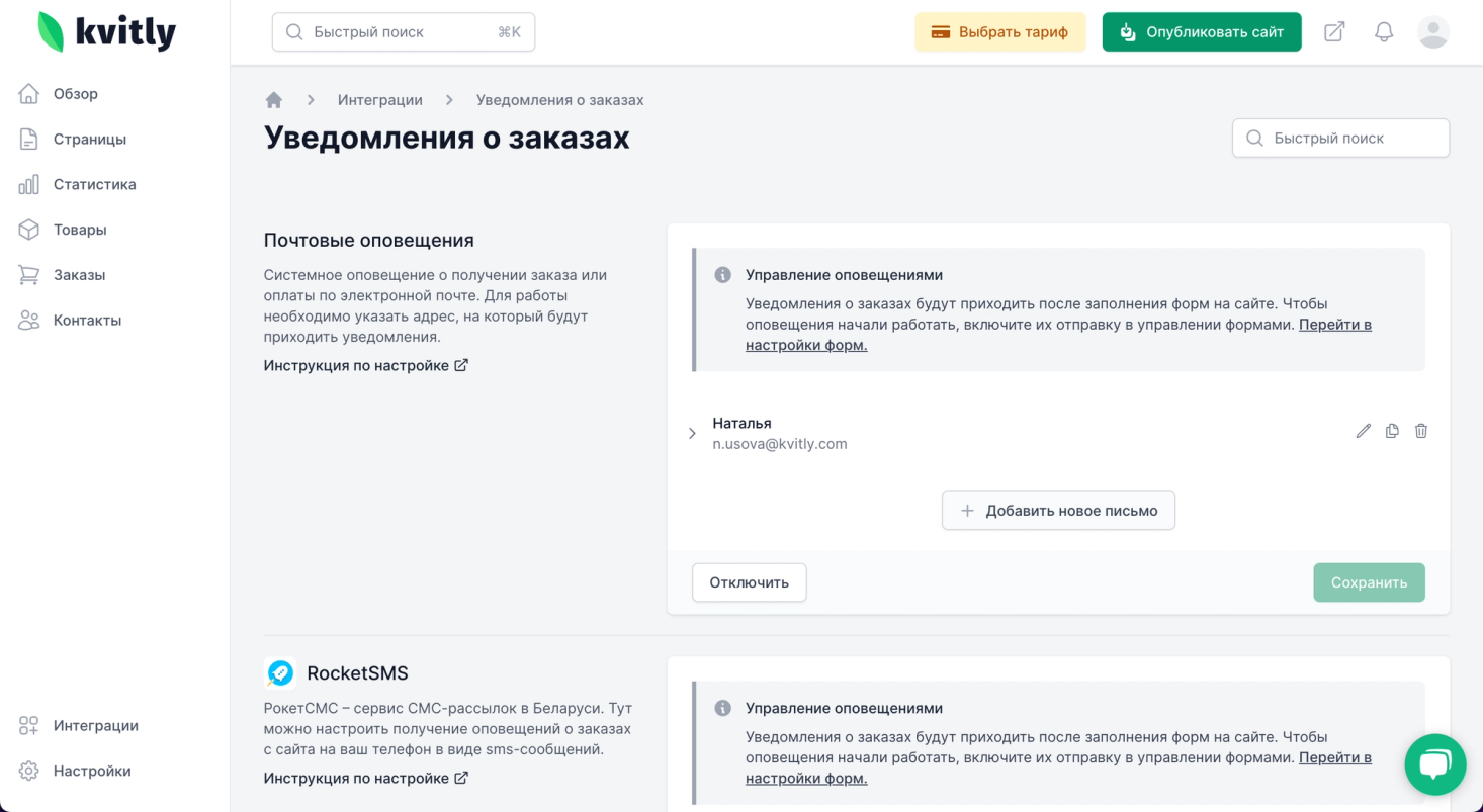 После регистрации аккаунта, оповещения обо всех заказах приходят на почту, которую вы использовали для создания аккаунта. Если у вас есть необходимость добавить для оповещений дополнительные адреса электронной почты, вы можете сделать это при помощи интеграции «Уведомления о заказах».