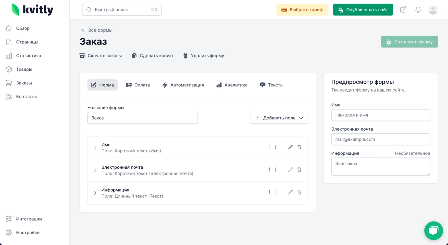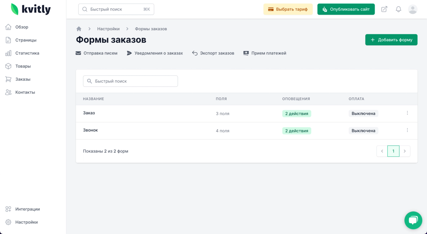 Теперь выберите формы, заказы из которых необходимо отправлять на добавленные электронные адреса. Для этого перейдите в раздел «Заказы», а затем в «Формы заказов» и откройте уже имеющуюся форму или создайте новую.